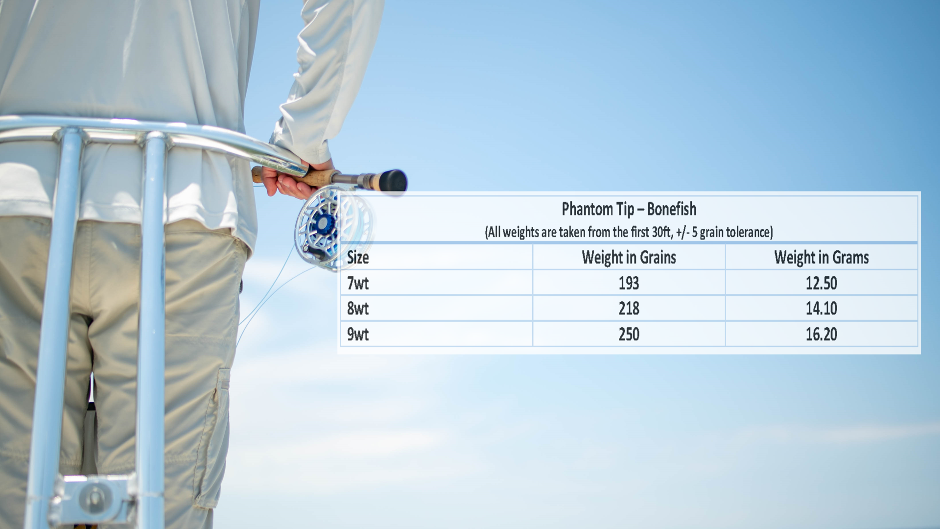 All Phantom Tip – Bonefish lines are weighted on the heavy side of the true AFFTA standards. You can see the weight ranges in the chart pictured here (weights are measured from the first 30 ft of the head). Many fly lines in today’s market are vastly over-weighted, sometimes up to 3 sizes. At Monic, we understand that not every angler is using a fast action rod or wants an ultra-heavy fly line forced into their hands. That is why we want to leave the decision up to you. After all, nobody knows your rod and fishing style better than you do.