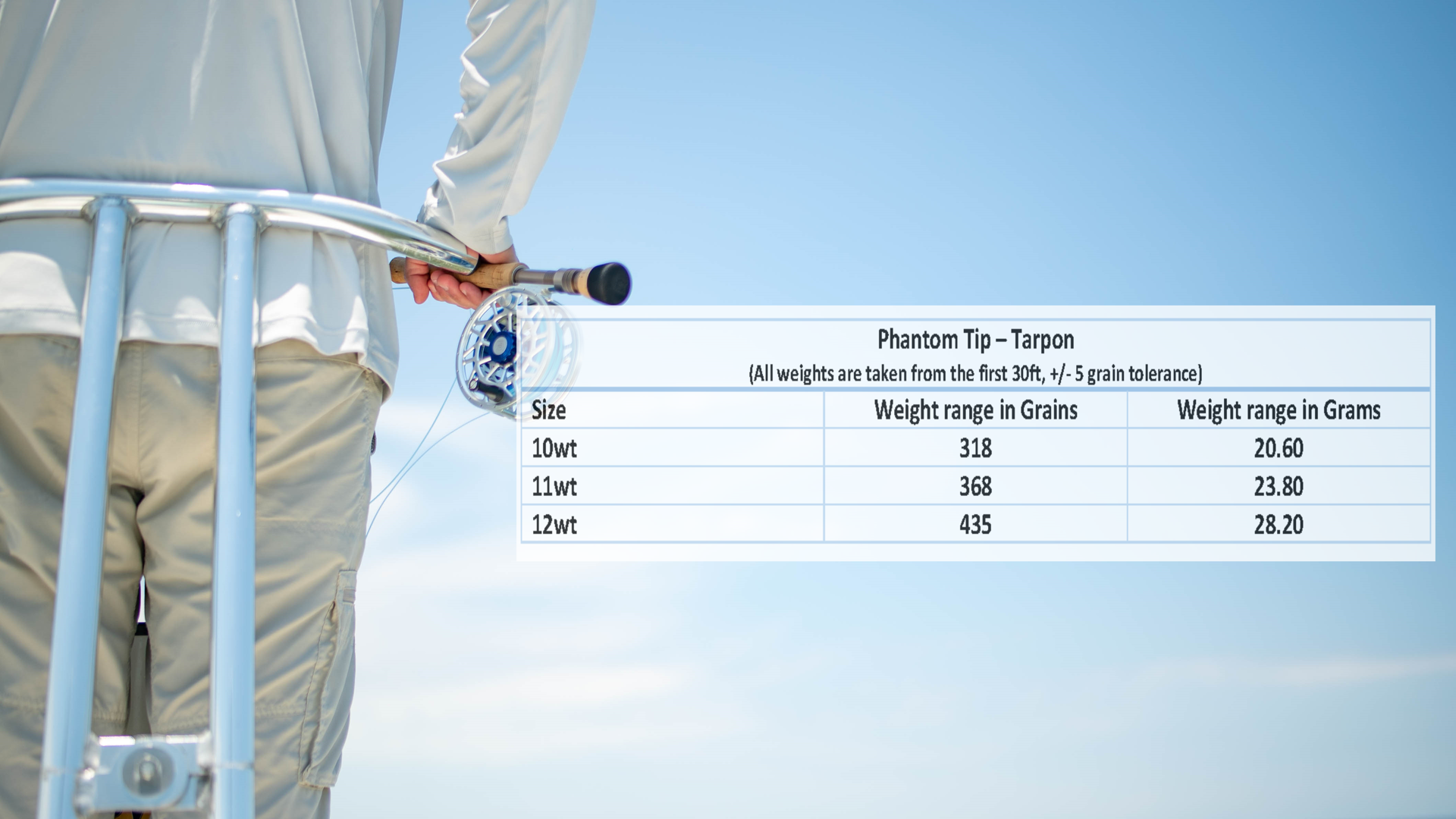Phantom Tip – Tarpon lines are weighted a half size above the AFFTA standards. You can see the weight ranges in the chart pictured here (weights are measured from the first 30 ft of the head). All of our lines manufactured here at Monic are constructed at or just above the AFFTA standards. Many fly lines in today’s market are vastly over-weighted, sometimes up to 3 sizes. At Monic, we understand that not every angler is using a fast action rod or wants an ultra-heavy fly line forced into their hands. That is why we want to leave the decision up to you. After all, nobody knows your rod and fishing style better than you do.